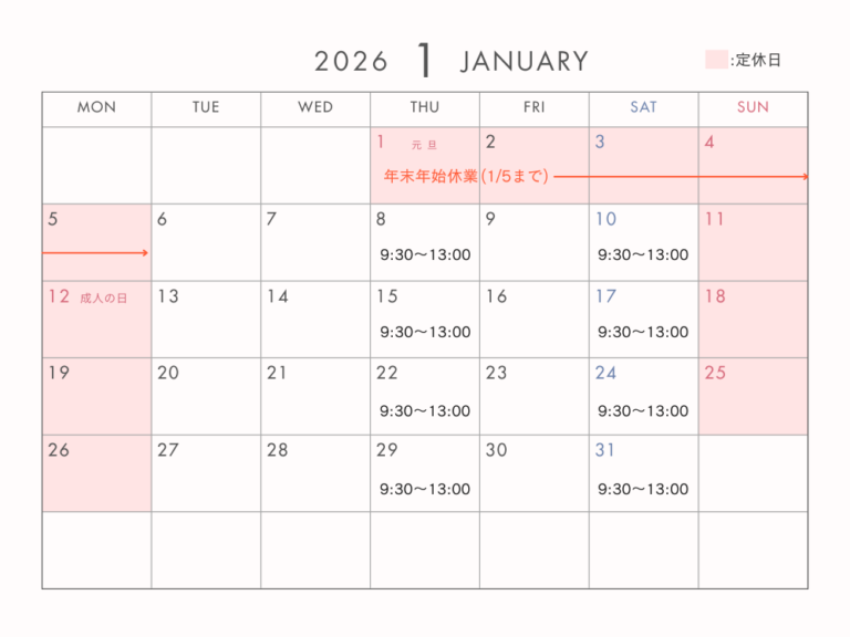 1月の営業日程|6日より通常営業スタート。年始の不調ケアはお早めに